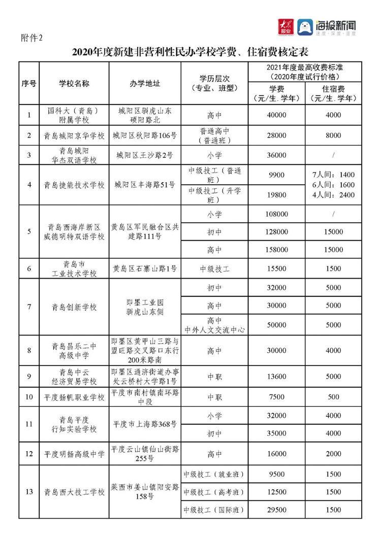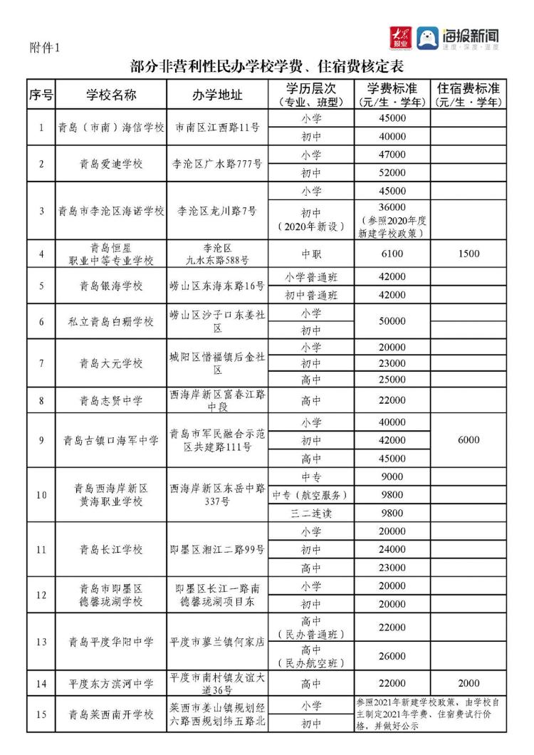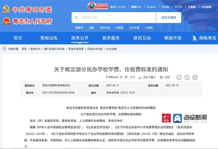 5月19日,记者从青岛政务网获悉,青岛市发展和改革委员会、青岛市教育局、青岛市人力资源和社会保障局联合印发《关于核定部分民办学校学费、住宿费标准的通知》(下文称“通知”),2021年青岛市有31所民办学校提出定调价申请,此次确定了28所学校的学费、住宿费标准,另有3所民办学校调价申请未予支持。