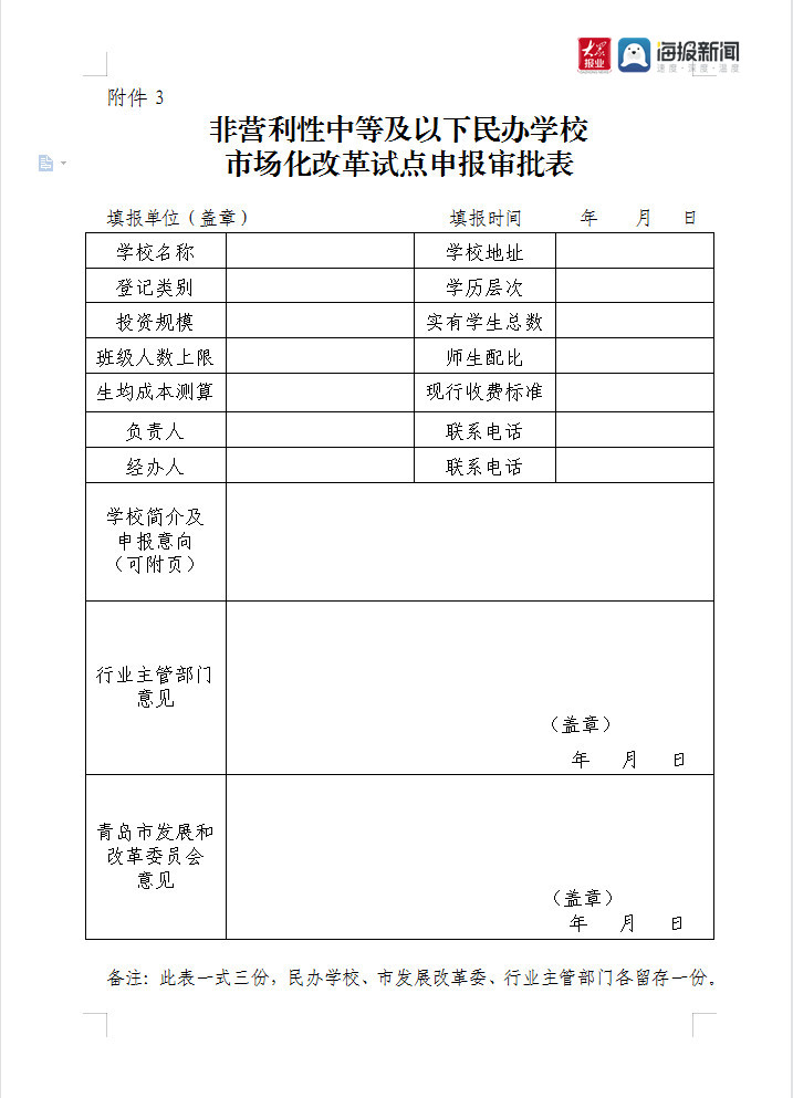 据介绍,经省政府同意,青岛市连续两年开展了民办教育收费市场化改革试点工作。按照分类指导、平稳有序推进的要求,今年拟延续现行政策,将部分发展定位高端、办学投入大、师生配比高、小班制特色化教学的民办学校纳入第三批民办教育收费市场化改革试点范围,由民办学校于2021年5月31日前向行业主管部门提报申请,并填写申报审批表,经市发展改革委审核认定后向社会公示。