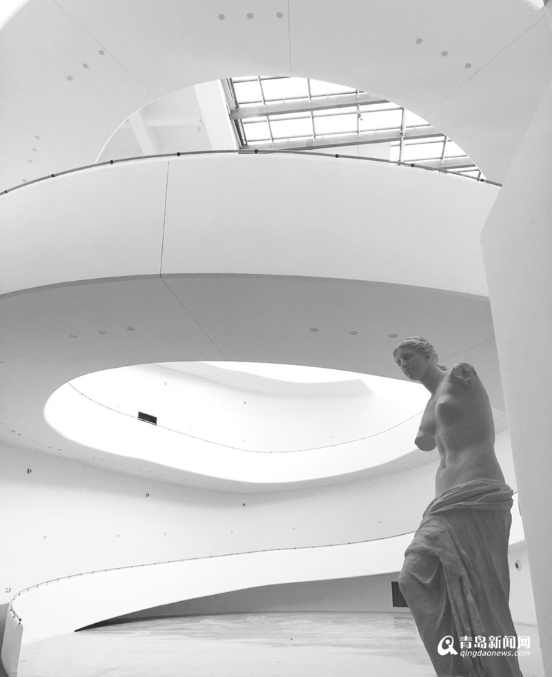 参观结束离开时,阳光透过楼顶的玻璃窗映入,馆内晕染着浅浅的金黄色,光影交错间,该楼中庭的旋转楼梯格外生动。从侧面看,它好像毫无束缚地悬浮在空中。“这个旋转楼梯的设计有多重概念,既是美感设计,美本身是旋转上升的概念,也是传承理念,人的思维概念成长也是上升的过程。”刘卫东说。
