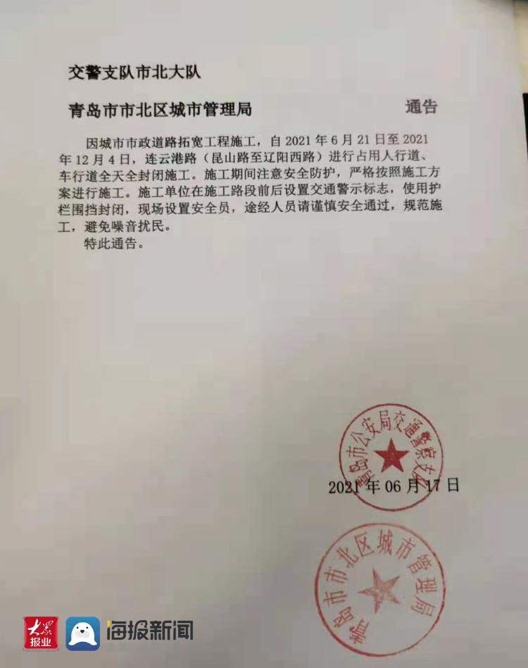 大众网·海报新闻记者从青岛中央商务区管委会获悉,日前,青岛市交警支队市北大队与青岛市市北区城市管理局联合下发通告,因城市市政道路拓宽工程施工,自2021年6月21日至2021年12月4日,连云港路(昆山路至辽阳西路)占用人行道、车行道全天全封闭施工。