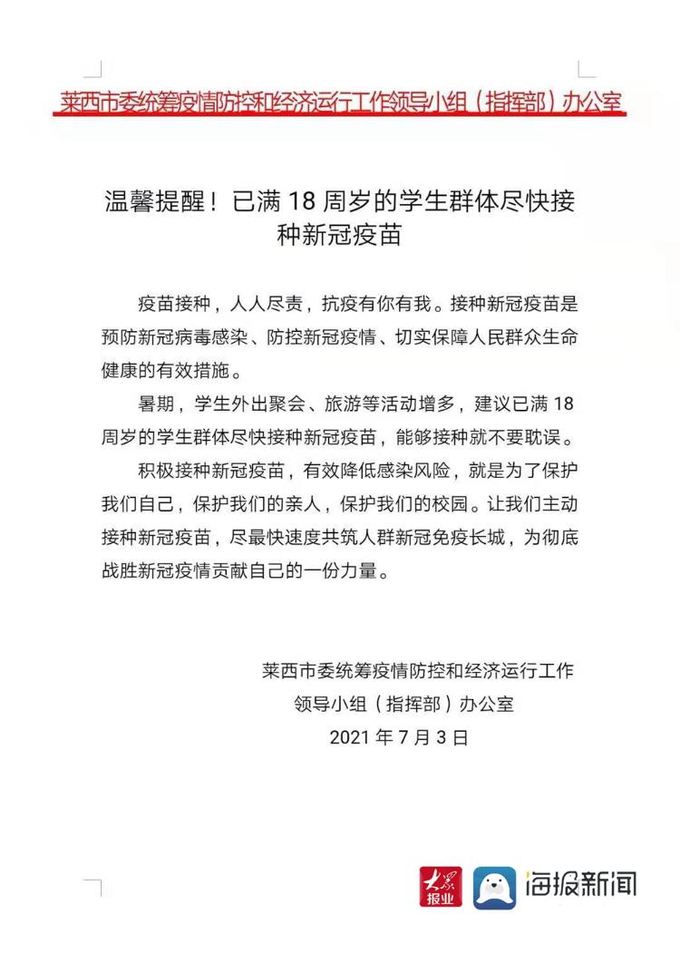 7月3日,莱西市委统筹疫情防控和经济运行工作领导小组(指挥部)办公室发布温馨提醒:已满18周岁的学生群体尽快接种新冠疫苗。
