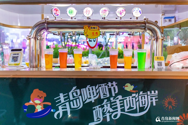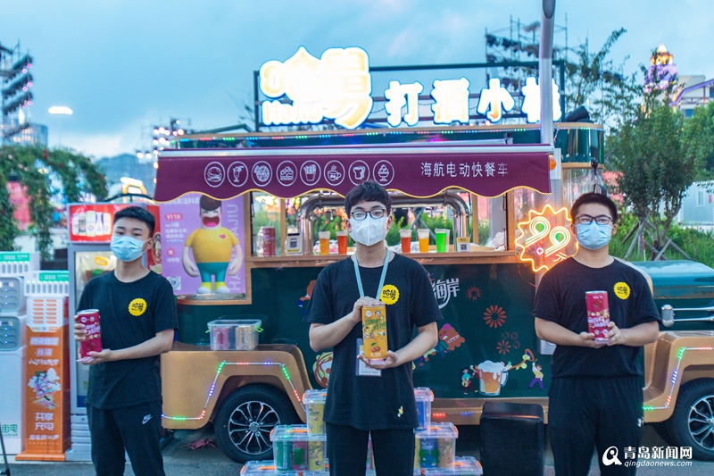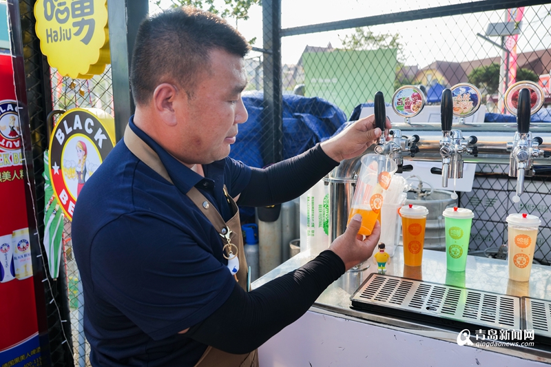 青岛新闻网7月23日讯(记者 陈志伟)7月22日下午5点,夏日的炎热尚未褪去,金沙滩啤酒城内已经热闹起来,青西金啤大篷对面的哈舅打酒小栈售卖车前早就排起了长队。