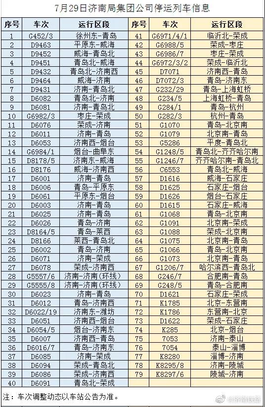 为积极应对台风“烟花”的影响,确保旅客安全出行,7月29日济南局集团公司停运79趟列车,较28日略有调整,详见下图。铁路部门将继续关注台风带来的影响,动态调整列车开行方案,列车停运、折返、晚点等信息,请以站车公告为准。