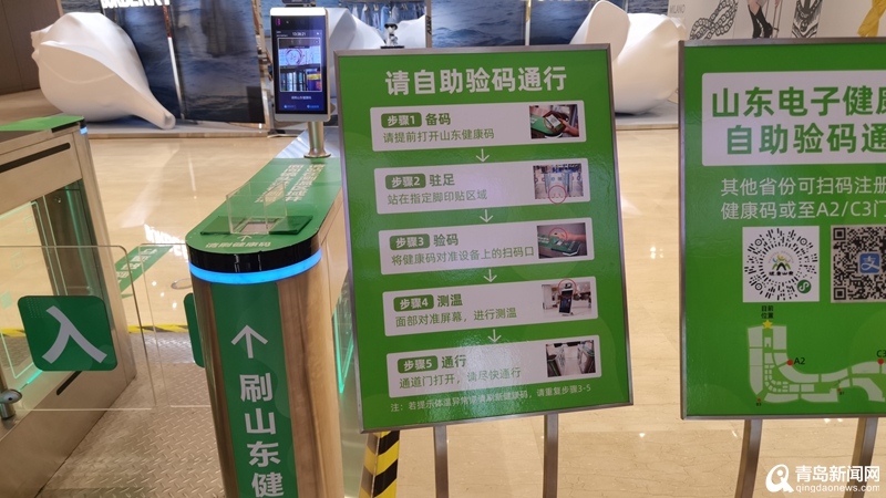 市民游客可以从青岛海信广场B1、B3、B5、C1门自助验码通行,全程自助无接触,5秒之内即可快速通行。