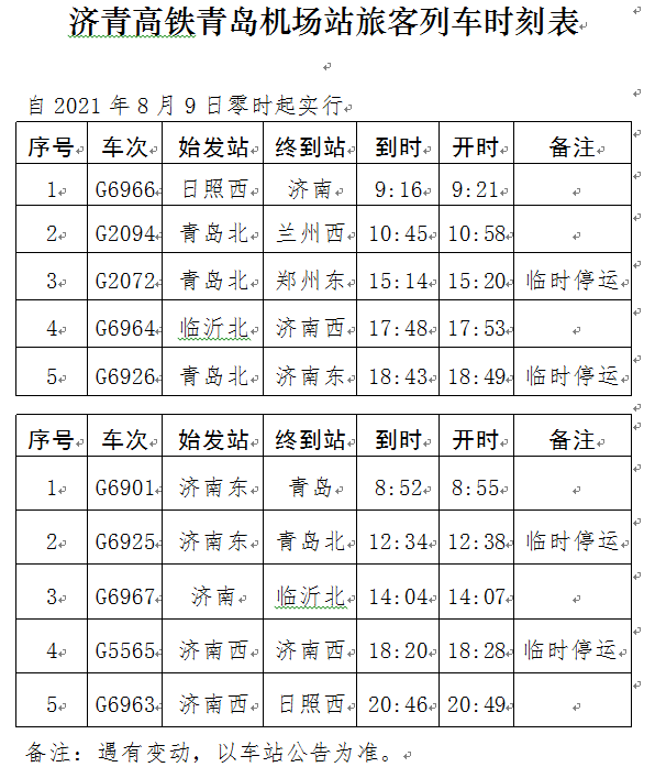 根据疫情防控需要,青岛机场站开行的G2072/69次、G6926次、G6925次、G5565/8次列车安排临时停运,铁路部门提示广大旅客及时关注12306网站(客户端)和车站公告,了解具体开行列车车次、时刻等信息,以便合理安排行程。(青岛日报社/观海新闻记者 吴帅文/图/视频)
