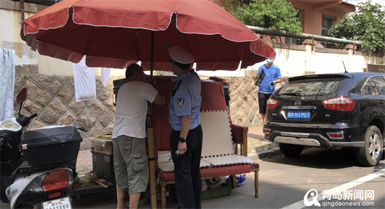 上午10点左右,记者跟随交警来到市南区朝城路,该路段多数车辆整齐地停靠在规定的停车位内,但一处简易版的“凉亭”吸引了执勤交警的注意。这个简易的乘凉装置由一把太阳伞和废弃沙发组成,经询问,是马路对面商铺店主的“杰作”。“为了乘凉也不能占用公共停车位。”在交警的劝说下,店主认识到了自己的错误,随即将遮阳伞和沙发拆卸挪走,恢复了停车区原有的样貌。