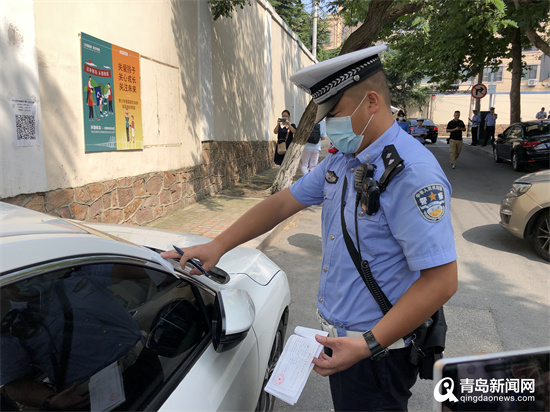10点40分,记者跟随交警来到在市北区宁化路,一辆白色的SUV违规停在一处居民楼的入口,不仅占用盲道,还将居民楼入口挡了一大半。随后,市北交警对该违停车辆贴罚单处罚。