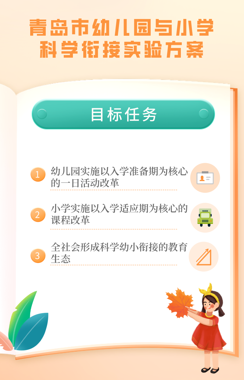 为全面深入推进幼儿园与小学科学衔接,帮助儿童实现从幼儿园到小学的平稳过渡,按照山东省教育厅关于开展幼儿园与小学科学衔接实验区的有关要求,青岛市教育局制定了《青岛市幼儿园与小学科学衔接实验方案》。