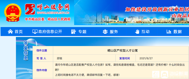 近日,有网友在青岛崂山政务网留言咨询崂山区产权型人才公寓的问题。