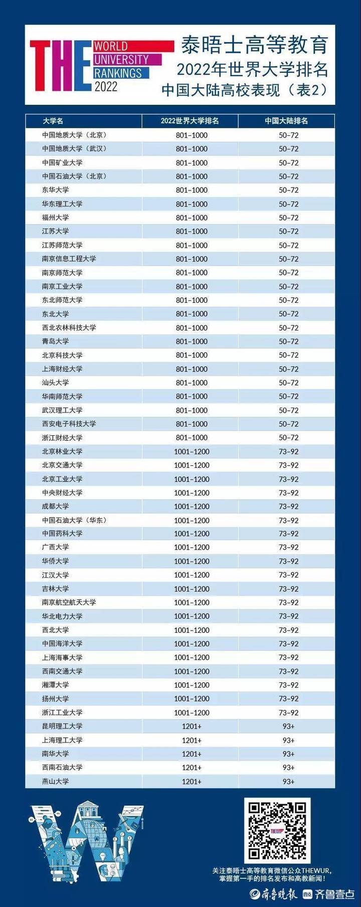 9月2日,泰晤士高等教育公布“2022年泰晤士高等教育世界大学排名”结果。驻青高校中,中国石油大学(华东)和青岛大学首次上榜。