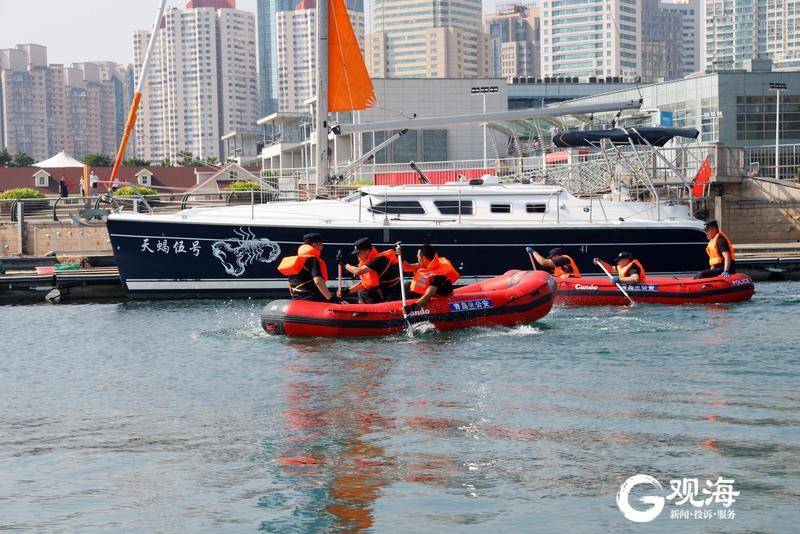 最激烈紧张、扣人心弦的环节是市内六分局代表队开展救生艇模拟救生比武竞赛。各单位通过抓阄方式确定比赛用救生艇和比赛航道,裁判监督宣读了比赛规则,总裁判长宣布“比赛开始!”,六名计时员同时按表计时,各代表队立即开始为救生艇充气,五个充气仓充满后迅速下水划桨,队员们统一节奏、团结协作,船桨滑动溅起朵朵浪花,“一二一二”和岸边的加油声此起彼伏。各代表队你争我赶、顽强拼搏,达到指定位置成功救助受困群众后迅速返航,形成百舸争流、奋勇争先的热烈氛围。最后经过激烈角逐,市南分局代表队荣获一等奖,李沧、开发区分局代表队荣获二等奖,市北、崂山、城阳分局获得优秀奖。