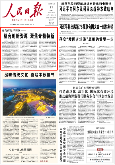 9月21日,《人民日报》头版以《青岛西海岸新区——整合创新资源 聚焦专精特新》为题,聚焦山东青岛。西海岸新区依托自身产业优势,瞄准关键领域,重点培育专精特新企业,探索“科研院所+企业”联合攻关,科技、教育、产业、金融紧密融合的创新体系。以下为报道全文: