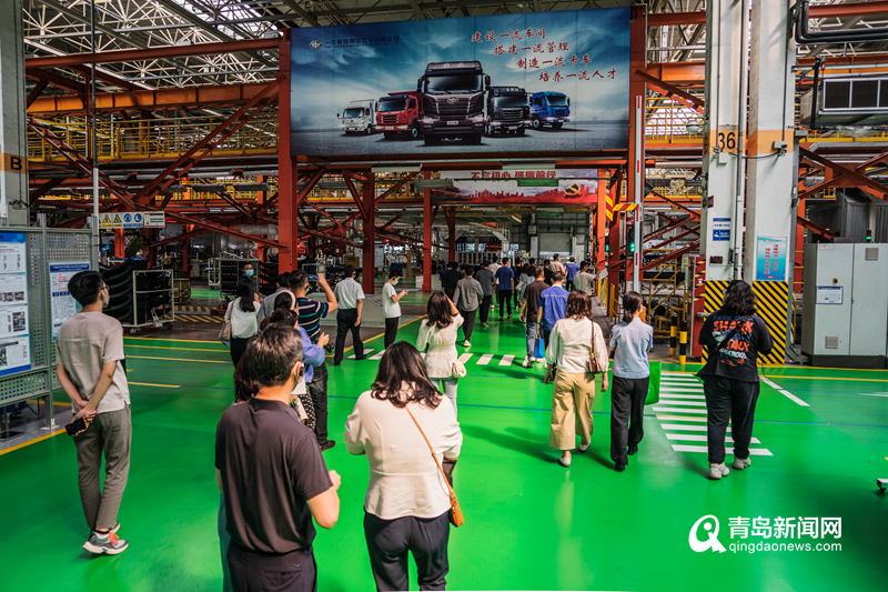 干净整洁的车间、一条条自动化生产线排列有序,采访团一行走进一汽解放青岛汽车有限公司的时候,焊装机器人正在熟练操作着装备零部件,企业内一派繁忙的生产景象。据企业负责人介绍,这里设有冲压、焊装、涂装、总装四大生产工艺车间,主要生产“解放牌”轻、中、重型卡车及其清洁能源和新能源产品,平均一天可以生产1000辆整车。