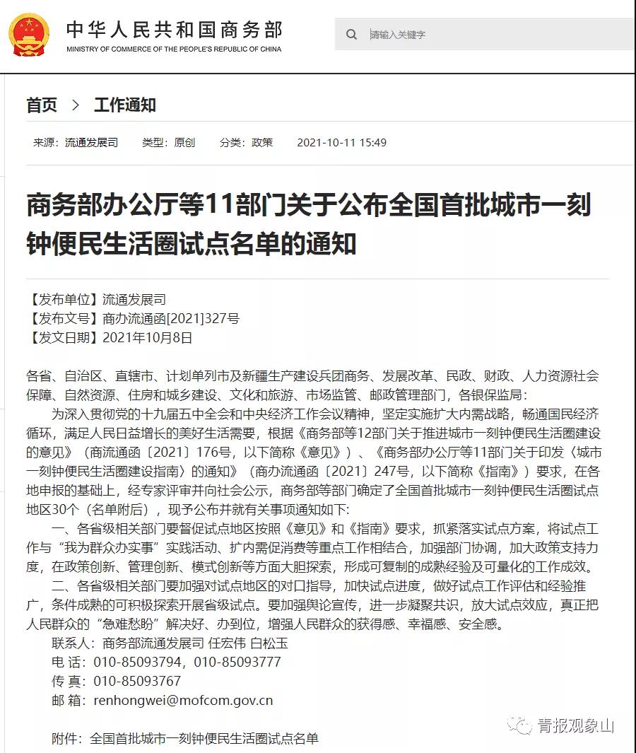 10月11日,商务部办公厅等11部门联合发布通知,正式公布了全国首批城市一刻钟便民生活圈试点名单,成都、武汉、宁波、青岛、西安、厦门等30城(区)入选。