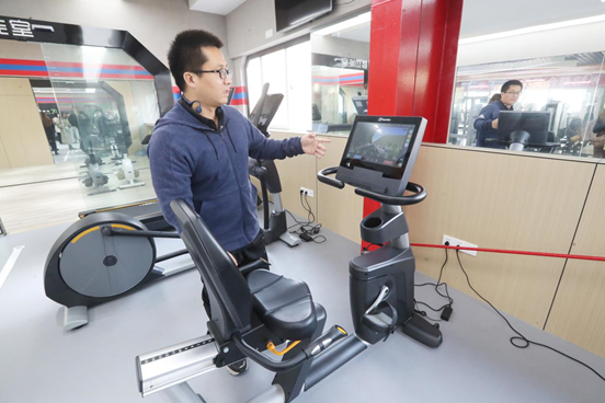在英派斯样品体验馆的智能健身房,记者体验了一把智慧健身。通过人脸识别进入到健身房后,在体质检测机完成自己的体质检测数据分析,随之生成的“运动处方”将会对健身者给出运动建议和方案。在一台勾腿训练器的操作屏幕上,记者看到人脸识别进入界面后,首次使用这台器械的健身者可以根据提示进行运动设定,通过传感器,器材会抓取到健身者的重量、力度等数据,然后在屏幕界面推荐运动行程,指导健身者规范健身,避免受伤。英派斯市场部产品经理李建兴还介绍了一款卧式磁控车,这款健身器材不仅可以和手机链接看到自己的运动数据和信息反馈,还可以在运动的同时看到自己喜欢的影视剧,也可以将手机投屏实时关注各类信息,为健身者带来诸多便利的同时增加了运动趣味。每一台智能化的健身器材就相当于一个专属的“健身私教”,突破时间和空间的局限,实现实时健身指导。
