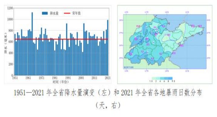 1月6日,山东省气候中心召开新闻发布会,介绍2021年山东省十大天气气候事件。记者从会上了解到,2021年,全省平均气温为14.5℃,较常年偏高1.1℃,为1951年以来次高;平均降水量为988.2毫米,较常年偏多53.2%,为1951年以来次多;平均日照时数为2196.6小时,较常年偏少194.7小时。