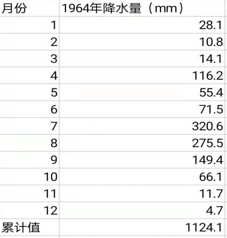 从上图可以看出,1964年全年降水量1124.1毫米,其中7月、8月、9月降水量最为集中,分别达到320.6毫米、275.5毫米、149.4毫米,3个月降水量共745.5毫米,占到全年降水量的66.32%,可见比重之大,这也和一般的山东降水时间集中段相符合。此外,4月份降水量达到116.2毫米,在春末夏初时间段,也是一个降水较高的月份。