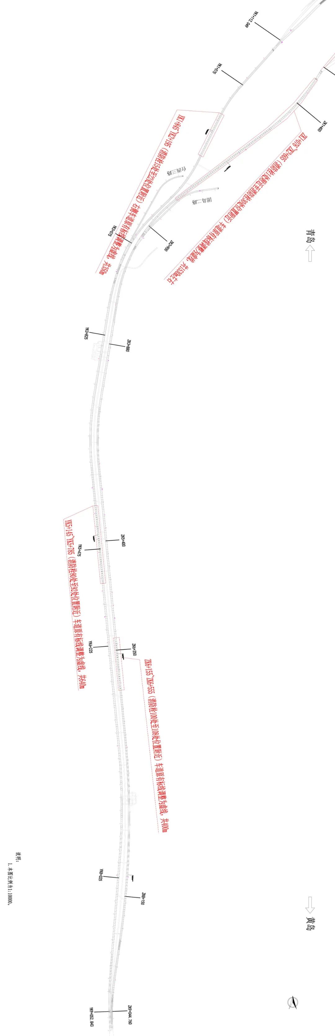 对青岛-黄岛方向隧道全线2个区段标线进行优化设计,增设可变道路段990m。
