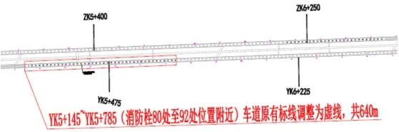 (2)为满足变道条件,提高运行效率,将隧道YK5+145至YK5+785(消防栓80处至92处附近),全长640m,车道原有标线调整为可跨越同向车行道分界线(白色虚线)。
