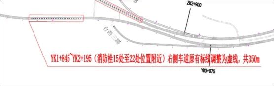 (1)为满足变道条件,提高运行效率,将隧道YK1+845至YK2+195(消防栓15处至22处附近),全长350m,右中车道分界线调整为可跨越同向车行道分界线(白色虚线)。