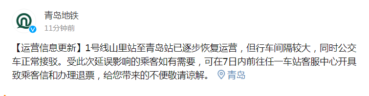 青岛日报社/观海新闻1月17日讯 观海新闻记者自@青岛地铁获悉:1号线山里站至青岛站已逐步恢复运营,但行车间隔较大,同时公交车正常接驳。受此次延误影响的乘客如有需要,可在7日内前往任一车站客服中心开具致乘客信和办理退票。