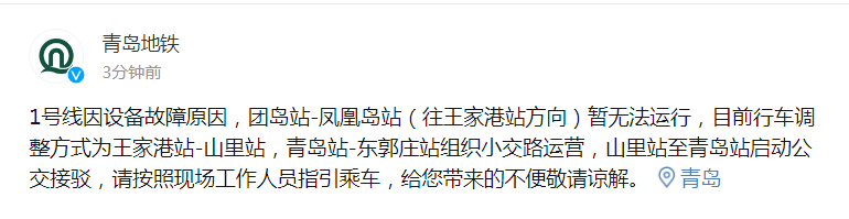 观海新闻记者自@青岛地铁获悉:1号线因设备故障原因,团岛站-凤凰岛站(往王家港站方向)暂无法运行,目前行车调整方式为王家港站-山里站,青岛站-东郭庄站组织小交路运营,山里站至青岛站启动公交接驳,请按照现场工作人员指引乘车。