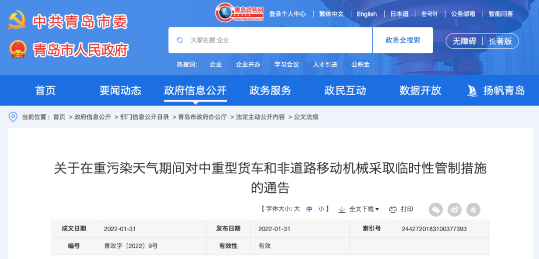 记者获悉,为加强大气污染区域联防联控,依据《中华人民共和国大气污染防治法》《山东省机动车排气污染防治条例》《山东省非道路移动机械排气污染防治规定》等有关规定,遇重污染天气时,青岛市政府将对中重型货车和非道路移动机械采取临时性管制措施。
