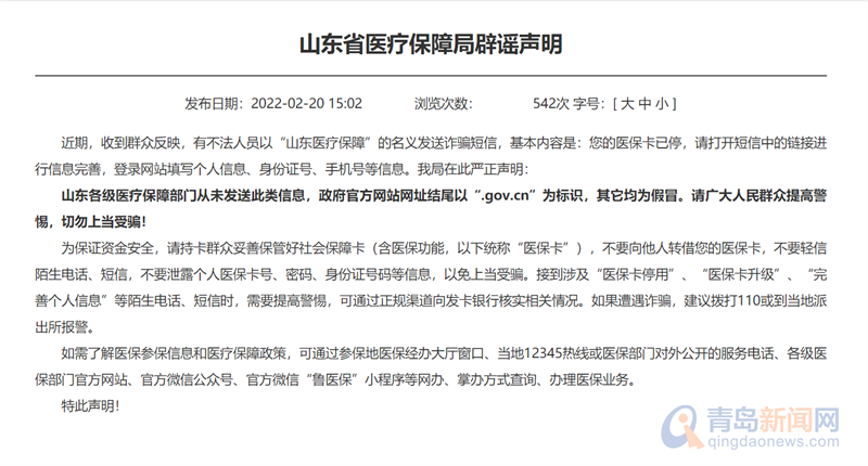 青岛新闻网2月21日讯(记者 李丽涛)昨日,山东省医疗保障局在山东省医疗保障局官方网站再次发布辟谣声明,《声明》中提到,近期,收到群众反映,有不法人员以“山东医疗保障”的名义发送诈骗短信,基本内容为“您的医保卡已停,请打开短信中的链接进行信息完善,登录网站填写个人信息、身份证号、手机号等信息。”对此,山东省医疗保障局严正声明,山东各级医疗保障部门从未发送此类信息,政府官方网站网址结尾以“.gov.cn”为标识,其它均为假冒。请广大人民群众提高警惕,切勿上当受骗!