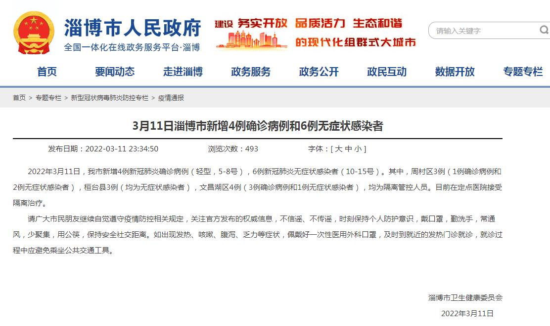 2022年3月11日,我市新增4例新冠肺炎确诊病例(轻型,5-8号),6例新冠肺炎无症状感染者(10-15号)。其中,周村区3例(1例确诊病例和2例无症状感染者),桓台县3例(均为无症状感染者),文昌湖区4例(3例确诊病例和1例无症状感染者),均为隔离管控人员。目前在定点医院接受隔离治疗。