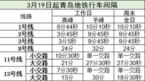 为配合做好疫情防控工作,自3月19日起,2号线东韩及11号线张村、枯桃3座车站暂停运营,列车不停站通过;2号线辽阳东路站B口关闭,其他口正常通行;1号线东郭庄至仙家寨(汽车北站)、8号线大涧至大洋共15座车站恢复正常运营。同时,青岛地铁1、8、11、13号线拉大行车间隔,2、3号线保持不变。请您合理安排出行。