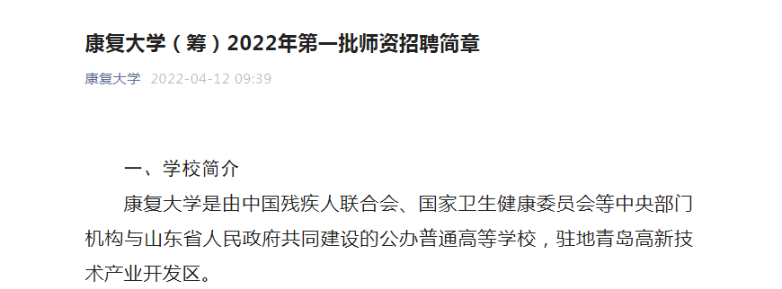 青岛日报社/观海新闻4月12日讯 今天,康复大学微信公众号发布康复大学(筹)2022年第一批师资招聘简章,明确招聘学科专业和数量及相关申请条件。具体内容如下: