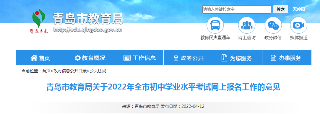 青岛市2022年初中学业水平考试网上报名定于4月14日(星期四)至17日(星期日)进行,请广大考生按照《青岛市教育局关于2022年全市初中学业水平考试网上报名工作的意见》要求按时报名。