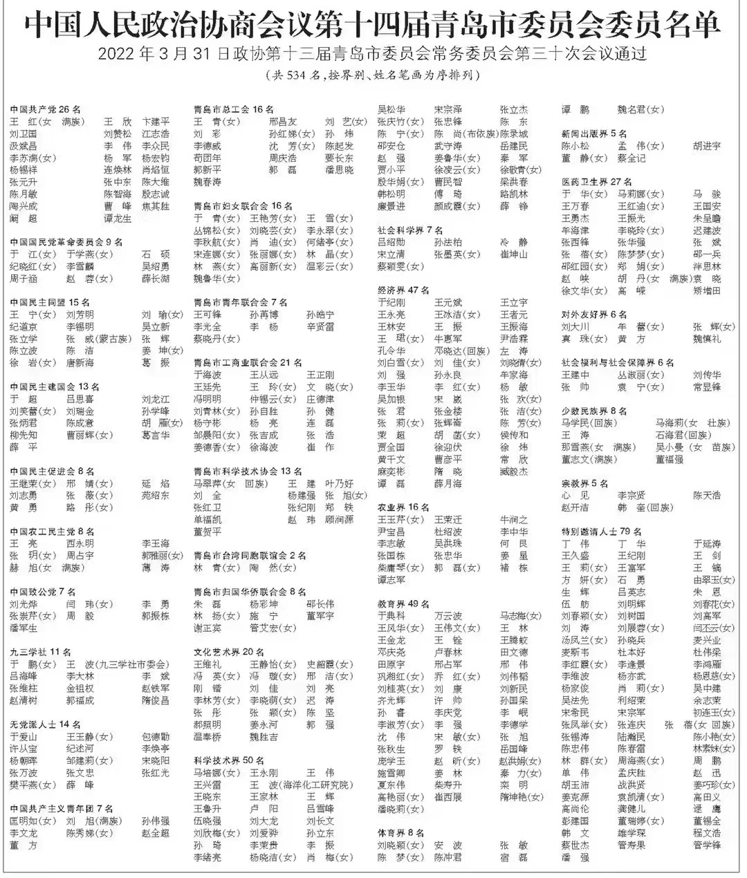 中国人民政治协商会议第十四届青岛市委员会委员名单