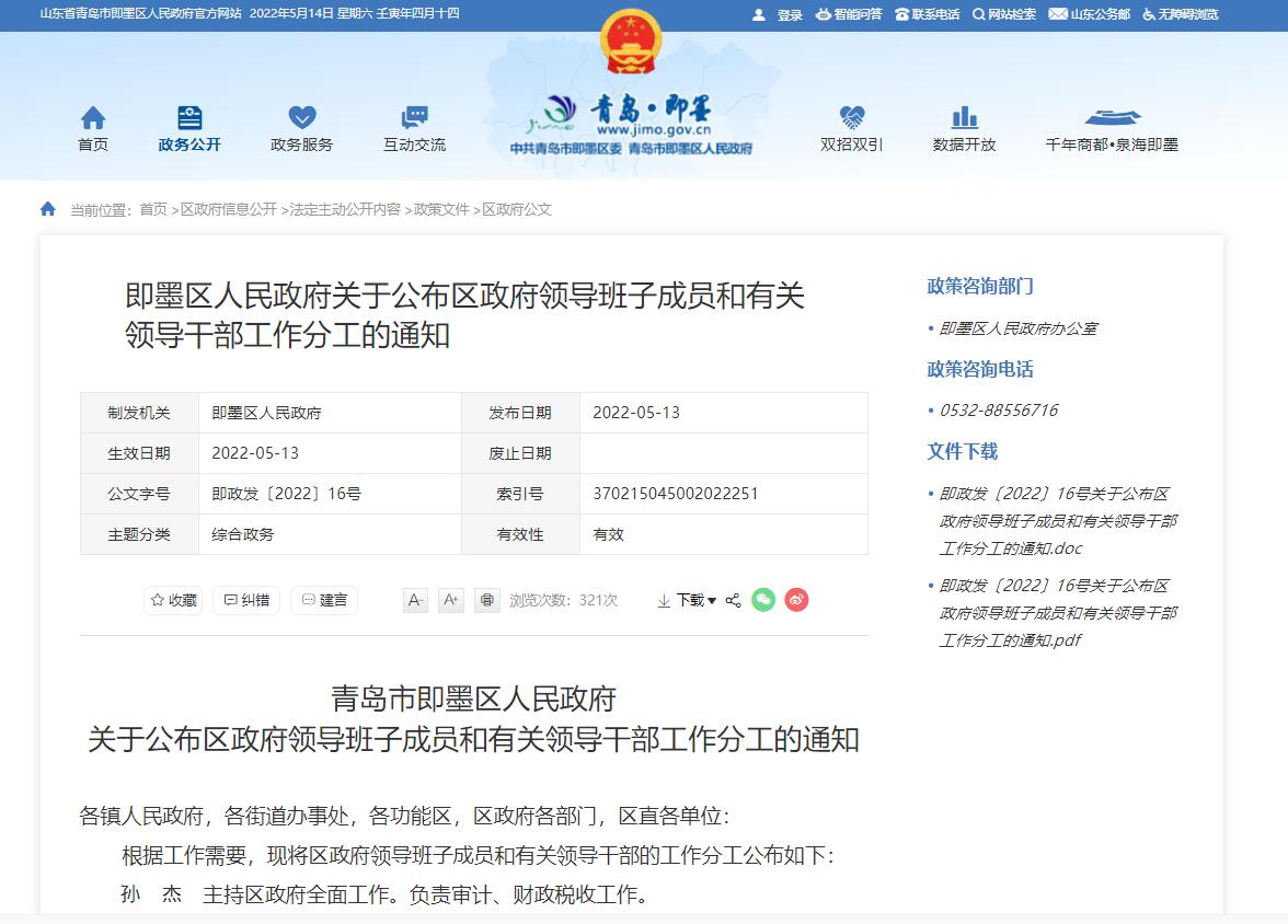 青岛市即墨区人民政府关于公布区政府领导班子成员和有关领导干部工作分工的通知
