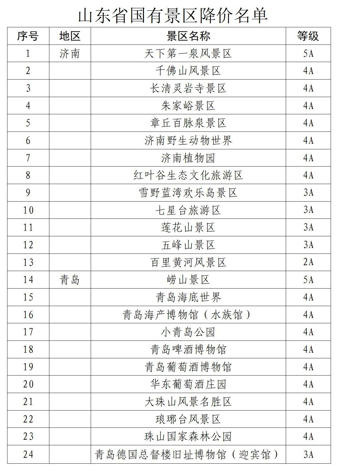 实施本次降价优惠的国有A级旅游景区,包括泰山、曲阜“三孔”、崂山、台儿庄古城等5A级景区12家,千佛山、青岛海底世界、原山国家森林公园等4A级景区60家,西海岸生态观光园、马踏湖生态旅游度假区等3A级景区60家,百里黄河风景区等2A级景区5家。