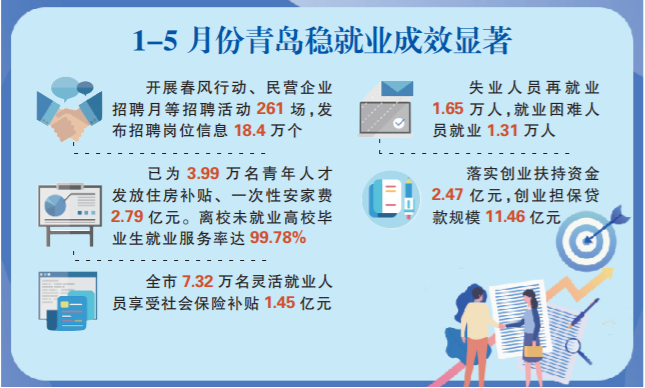 除此之外,今年以来,青岛实施城乡公益性岗位扩容提质行动,开发3.7万个岗位,重点安置城镇大龄失业人员、零就业家庭成员,确保困难群体尽快就业、稳定就业。今年1至5月份,失业人员再就业1.65万人,就业困难人员就业1.31万人。