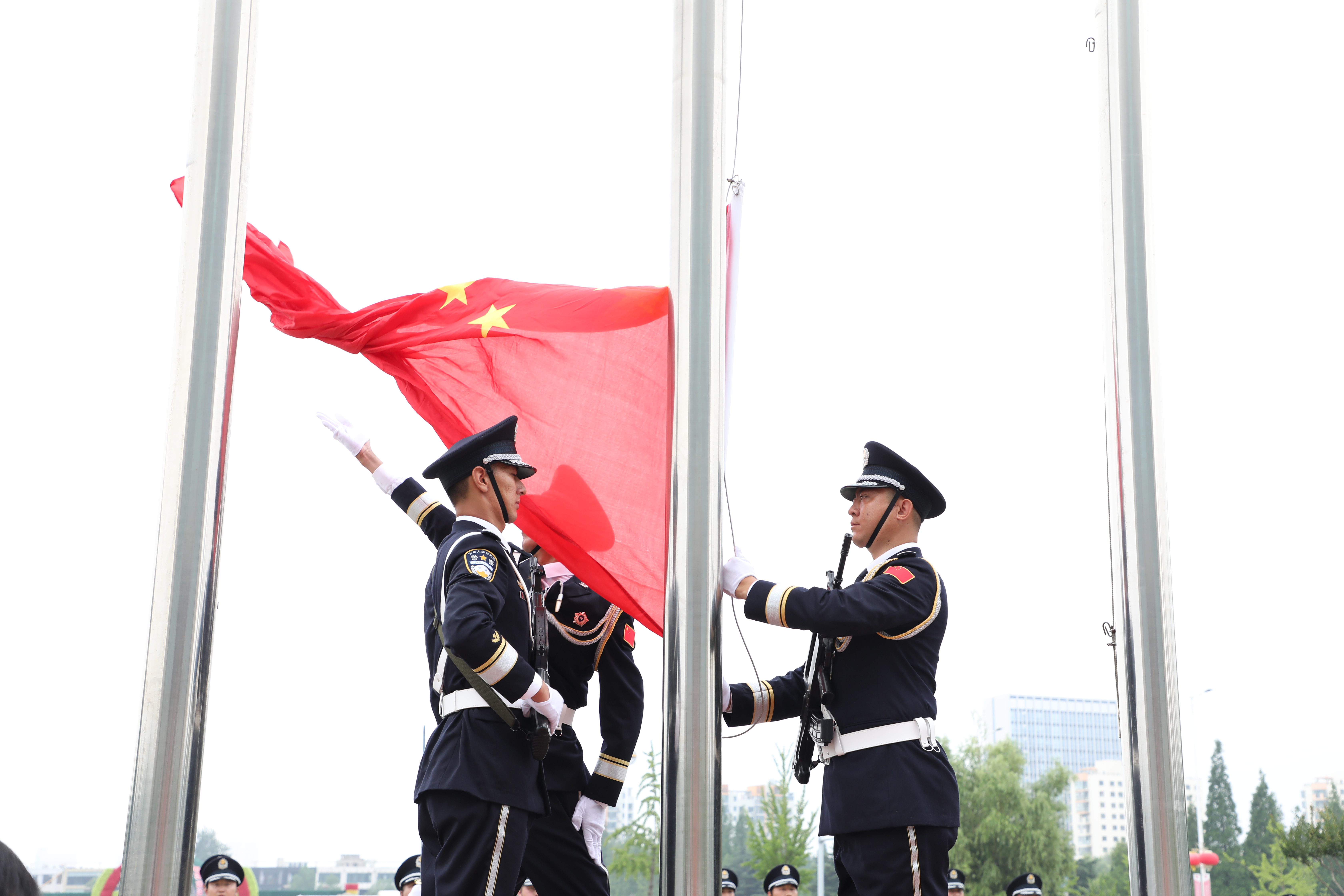 上午8点,莱西市委副书记、市长刘瑛宣布升国旗仪式正式开始。护旗手和仪仗队手擎国旗,迈着坚定有力的步伐护送国旗行进至升旗台,伴随着雄壮的《中华人民共和国国歌》,鲜艳的五星红旗迎着旭日冉冉升起,参加仪式的全体人员怀着激动的心情向国旗行注目礼。