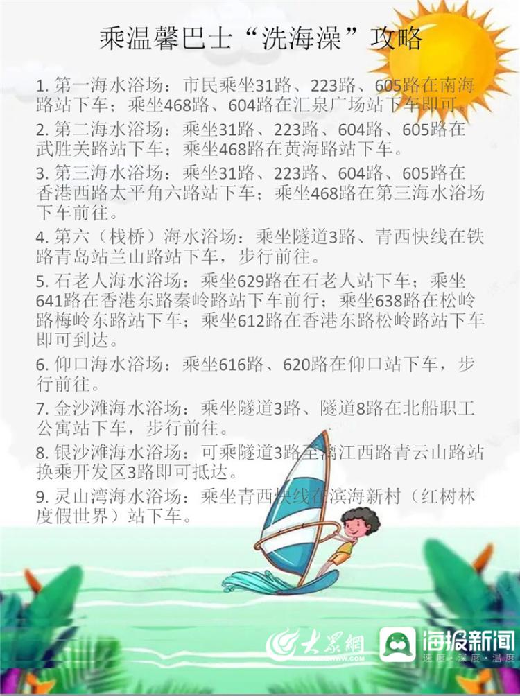 其中,温馨巴士31路、223路、468路、604路、605路途经第一海水浴场、第二海水浴场、第三海水浴场;612路、638路、641路、629路途经石老人海水浴场;616路、620路途经仰口海水浴场;隧道3路、隧道8路途经金沙滩浴场;乘坐隧道3路换乘开发区3路可前往银沙滩浴场;青西快线途经城市阳台海水浴场。为了方便市民“洗海澡”,这些温馨巴士公司途经海水浴场线路均配备了机动运力,视客流情况加大发车密度,并在高温天气及周末高峰期重点投放运力,减少市民在高温天的等车时间。