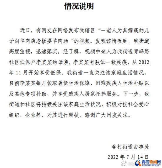 就在7月14日当天,青岛市李沧区李村街道办事处发布一份“情况说明”回应了“被拾荒老奶奶整破防了”的视频内容,经了解视频中老人为低保户李某某的母亲,将持续关注该家庭生活状况,积极对接社会爱心组织、企业等,对其进行帮扶。微博发出后,近4万网友点赞,置顶评论更是温暖人心。