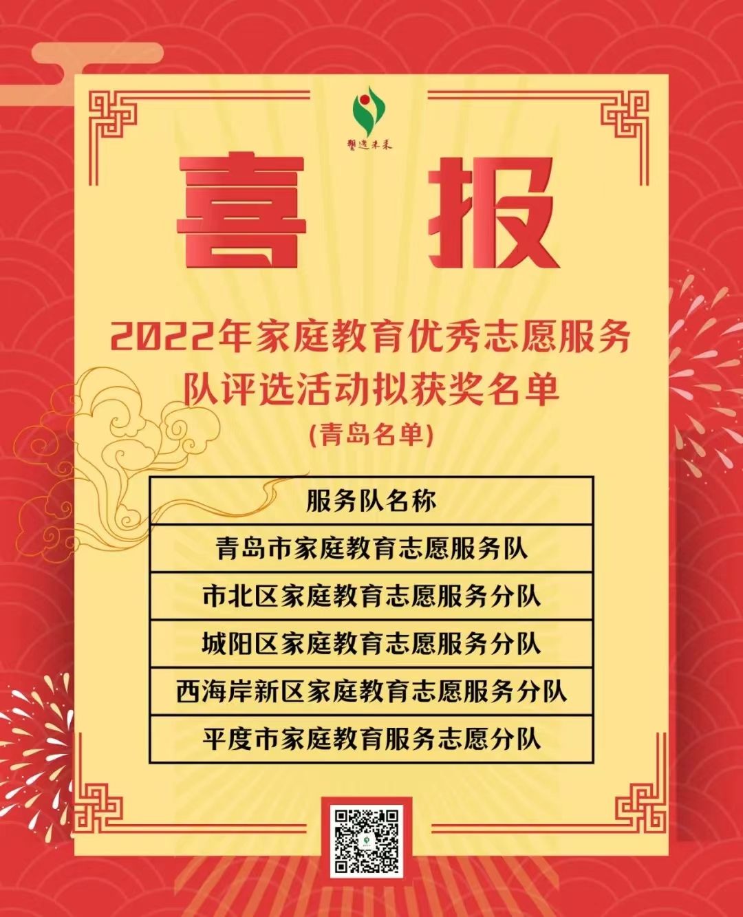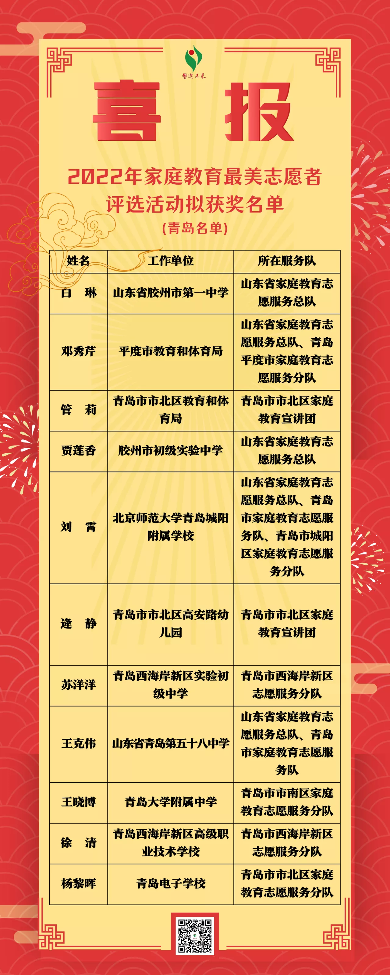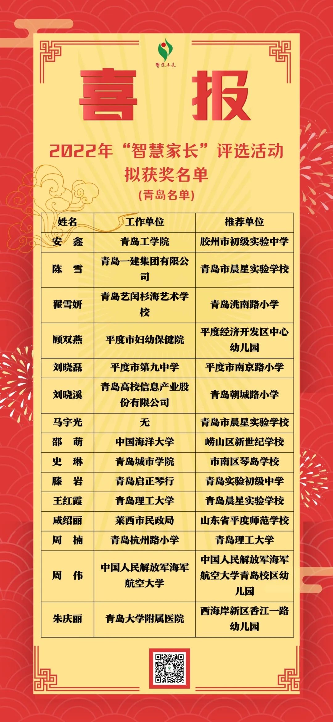 青岛工学院安鑫等15人入选2022年“智慧家长”拟获奖名单,胶州市第一中学白琳等11人入选2022年家庭教育最美志愿者拟获奖名单,青岛市家庭教育志愿服务队入选2022年家庭教育优秀志愿服务队拟获奖名单。(青岛日报/观海新闻记者 赵黎)