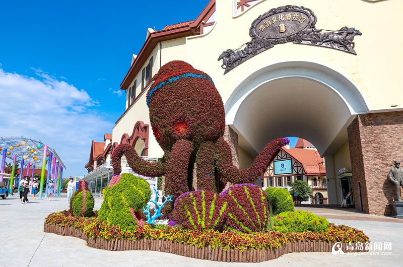 位于啤酒文化博物馆门前,以八爪鱼为主景,搭配其他海洋生物,打造八方来贺的迎宾花艺。