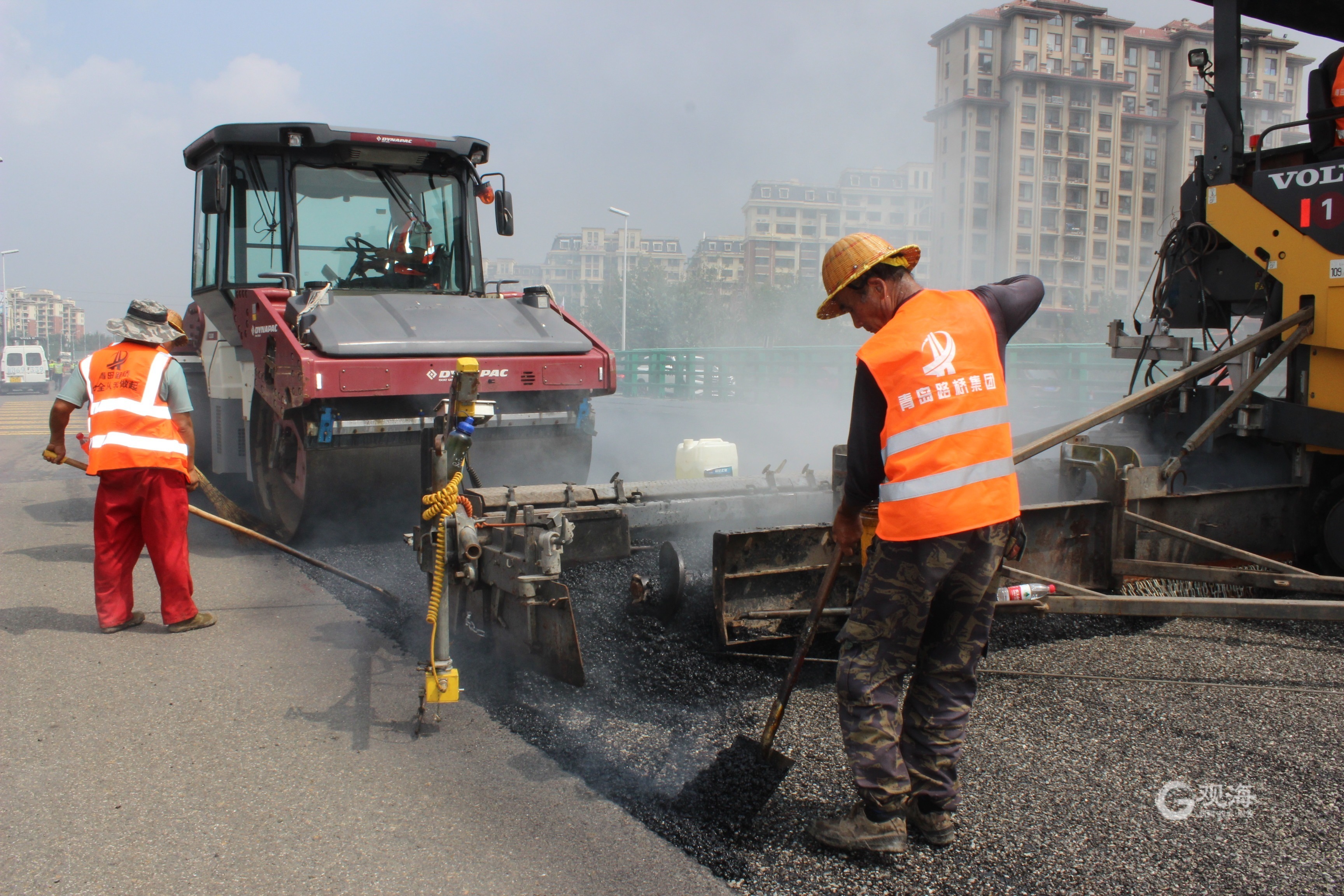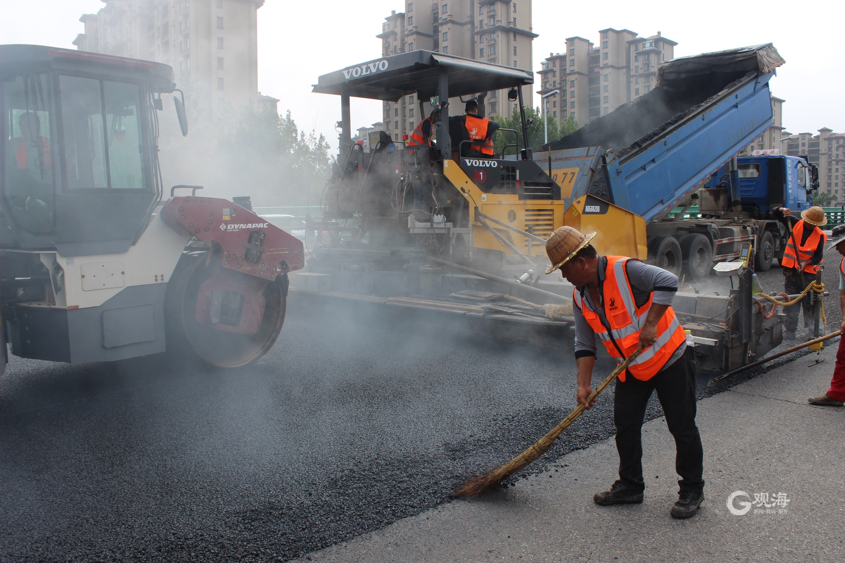 在施工现场,记者看到,项目建设者们正趁着晴好天气,与时间赛跑,与烈日并肩,为尽早抢通主线而奋斗正酣。高温下的路面,加上沥青本身所散发的热量,施工现场的气温已直逼40℃,人远远地站着,也会烤得脸上直冒汗,但施工人员依旧干得起劲,即使汗流浃背,也要反复检查路面的平整度、压实度和温度,确保质量控制符合规范。