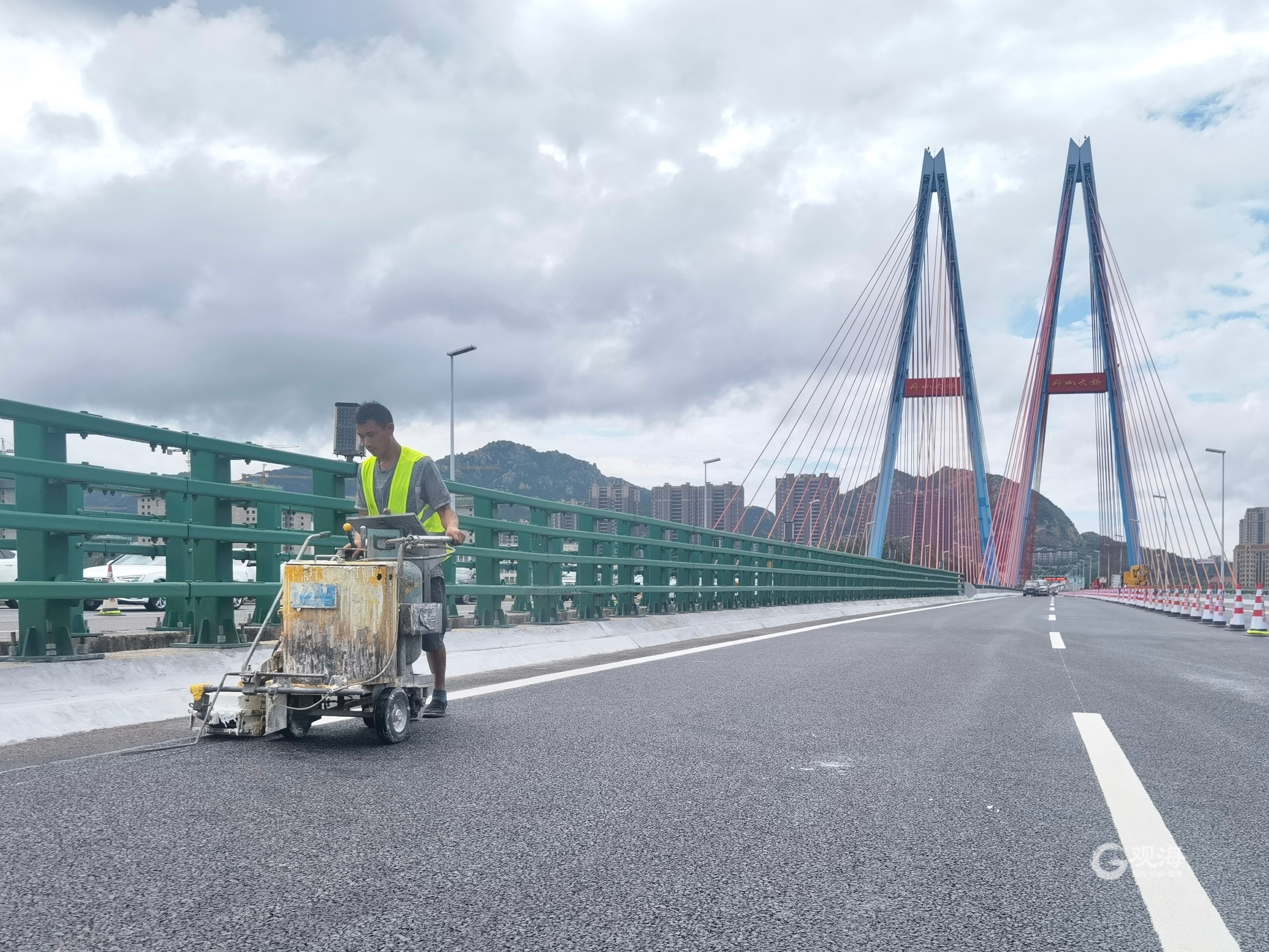 针对传统混凝土工艺凝固时间久、强度低的问题,采用高强快凝C50混凝土进行伸缩缝修补,有效减少结构断面,提升致密坚硬度,并大大缩短凝固强度时间,为抢占施工“黄金期”打下坚实基础。针对近期连续降雨影响施工等问题,投入路面干洗车,加大人工清水、排水力度,雨后充分利用大功率吹风设备,加快路面层间雨水蒸发风干,抢占路面摊铺施工时机。针对暑运期间车流量增大的实际情况,集中全力首先抢通主线,将混凝土护栏防腐、破损护轮带水泥高强修补料修复等非制约性附属工程,全部暂缓至恢复正常通行后。