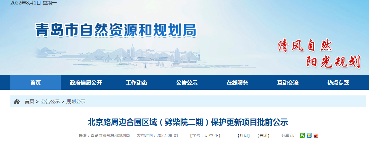 青岛日报社/观海新闻8月1日讯 今天,青岛市自然资源和规划局发布《关于北京路周边合围区域(劈柴院二期)保护更新项目进行社会公示的通告》以及北京路周边合围区域(劈柴院二期)保护更新项目批前公示。