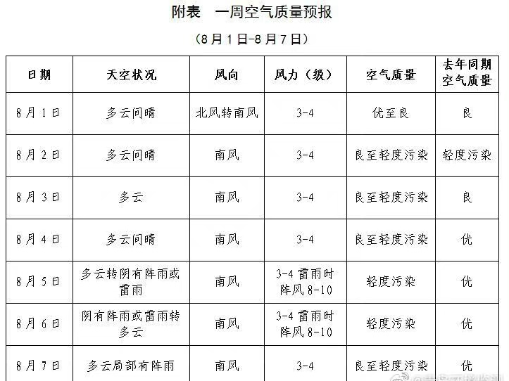 周日(8月7日),多云局部有阵雨,南风,污染扩散条件一般,预计空气质量为良至轻度污染,首要污染物为O₃或PM10。