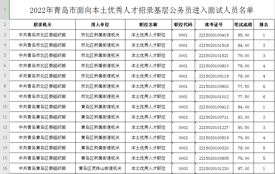 根据《2022年青岛市面向本土优秀人才招录基层公务员公告》有关规定,现将2022年青岛市面向本土优秀人才招录基层公务员进入面试人员名单及有关事项公告如下: