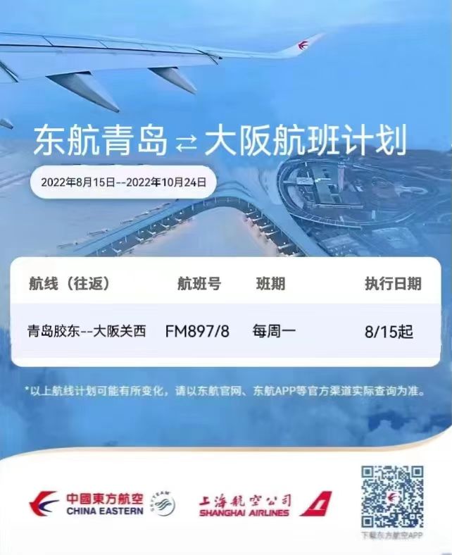青岛日报社/观海新闻讯 8月15日起,东航将恢复青岛至大阪往返直飞航线,每周往返一班,班期为每周一。这是自2020年因疫情影响国际航线停航以来,东航在青岛地区恢复的首条国际客运航线,也是山东地区疫情后国内航司恢复的首条日本正班客运航班。
