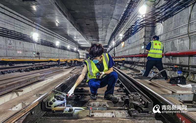青岛地铁通号部信号专业人员汛期密切关注道岔状态,进行24小时检测作业。青岛地铁线网各车站防汛、服务“两不误”。