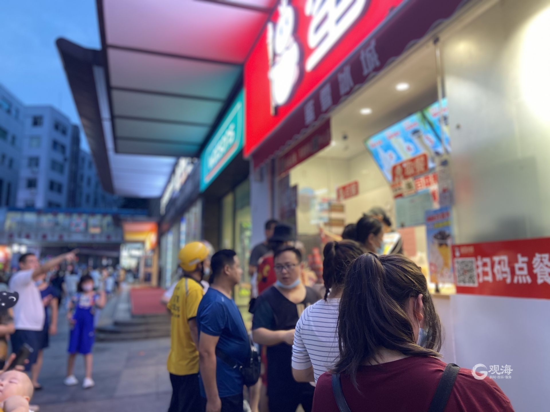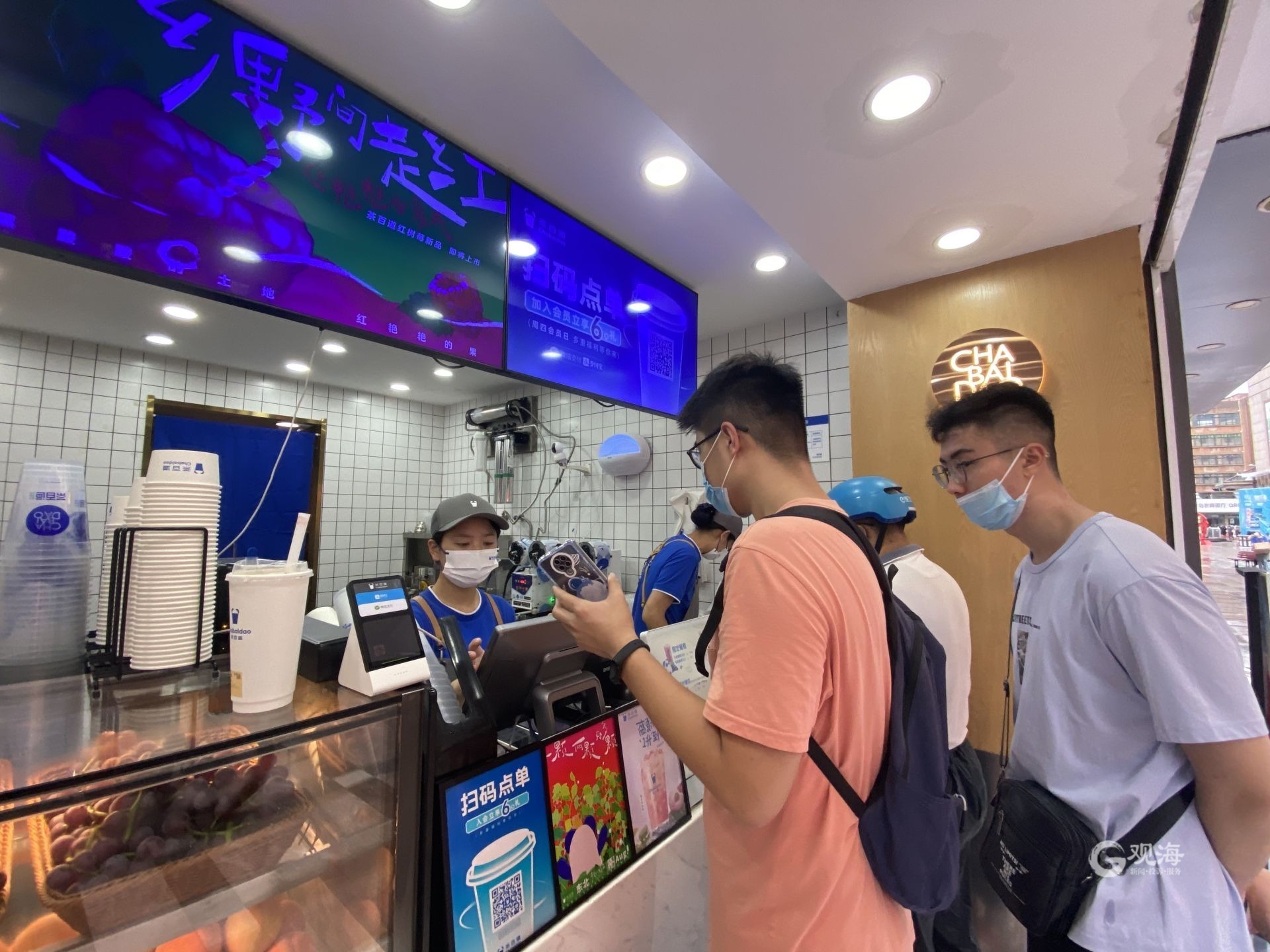 顾客在岛城一家茶饮店门口排队等候点单。