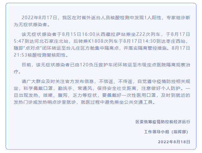 该无症状感染者于8月15日16:00从西藏拉萨站乘坐Z22次列车,于8月17日5:47到达河北石家庄北站,后转乘K1808次列车于8月17日14:30到达枣庄西站,随即“点对点”闭环转运至台儿庄区方舱集中隔离点,并落实隔离管控措施。8月17日21:53核酸检测复核阳性。